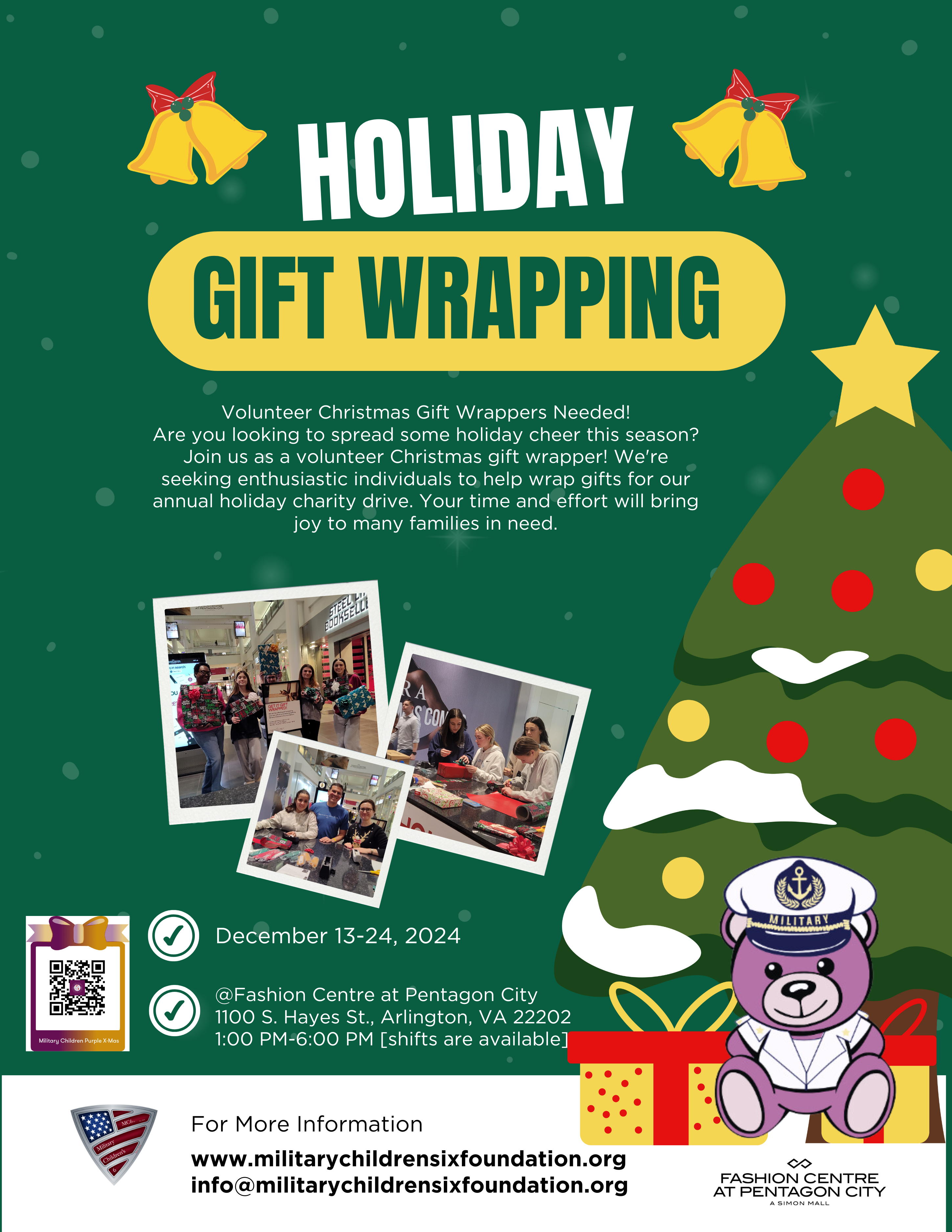 Enjoy wrapping in the Gift of Christmas by wrapping gifts for mall patrons at Fashion Centre at Pentagon City Mall beginning Friday, December 13th through Tuesday, December 24th.  Shifts vary depending on the day of the week.  Monday through Saturday (1pm - 7pm); Sunday (1pm - 5pm); Christmas Eve (9am - 6pm).  We ask that you consider working a 3-hour minimum shift.